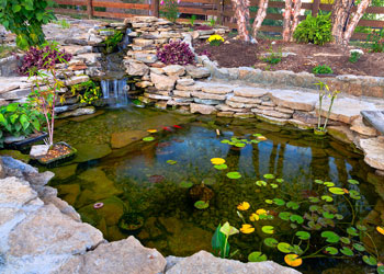 การจำลองธรรมชาติมาสู่ที่พักอาศัย ไม่ได้มีเพียงแต่นำต้นไม้ใบหญ้ามาจัดองค์ประกอบเท่านั้น แต่เพื่อความเป็นธรรมชาติอย่างสมบูรณ์ย่อมต้องมีน้ำเข้ามาผสมผสาน  ซึ่งน้ำนั้นจะนำความชุ่มชื้นเข้าสู่พื้นที่ เป็นตัวรักษาอุณหภูมิให้เกิดความเย็นสบาย เสียงน้ำไหลสร้างความรู้สึกผ่อนคลาย งานบ่อปลา, สระน้ำ, น้ำตกและน้ำพุ  ถือเป็นส่วนหนึ่งของงานฮาร์ดสเคปแต่เฉพาะเจาะจงงานที่เกี่ยวกับ “น้ำ”  เพิ่มโอกาสให้เราสามารถปลูกไม้น้ำได้อีกหลายชนิด อีกทั้งบ่อน้ำขนาดใหญ่จะช่วยกักเก็บน้ำสามารถนำมารดน้ำต้นไม้ และช่วยหมุนเวียนน้ำในบ่อ